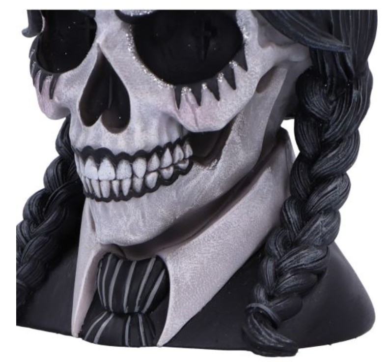 Questo pezzo di grande impatto presenta un teschio adornato da una frangia vaporosa e da ordinate trecce, che gli conferiscono un carattere misterioso e bizzarro.