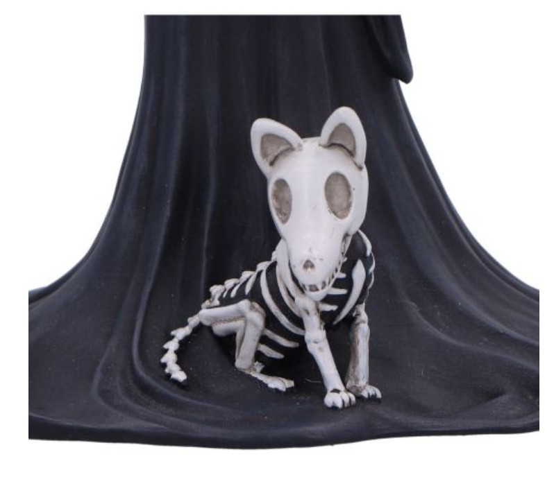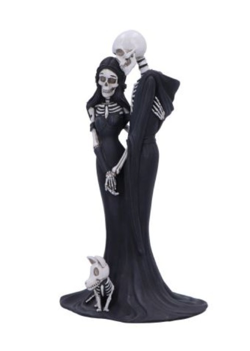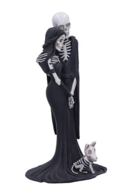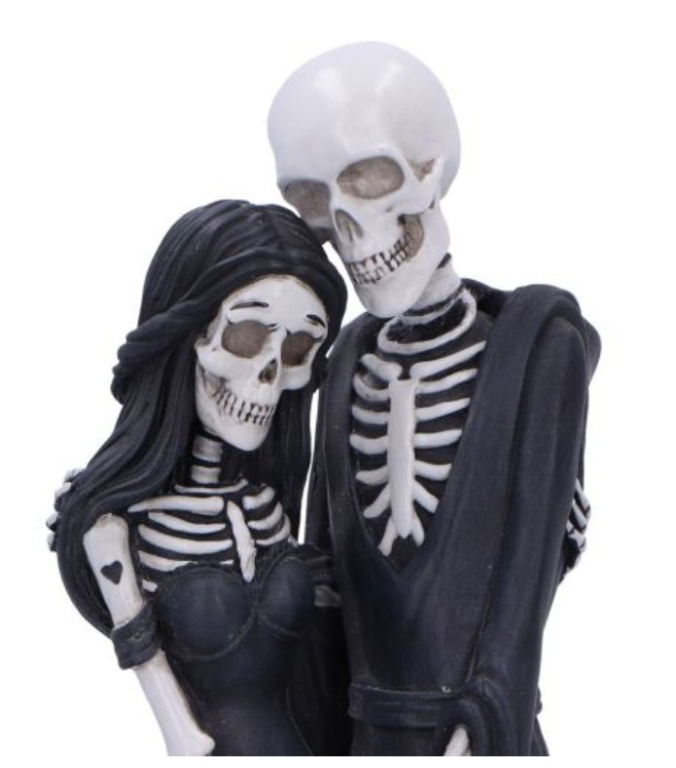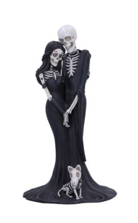 La statuetta raffigura due scheletri innamorati in un tenero abbraccio, mentre il loro cane scheletrico siede ai loro piedi, a simboleggiare un legame che sfida la mortalità.
